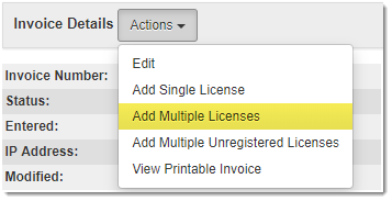 At the top of the Invoice Details page, use the Actions drop-down and choose Add Multiple Licenses. Refer to the Field List above for additional information on each option:
