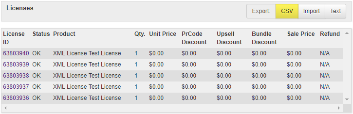 To export the list of License IDs and Passwords, scroll down to the Licenses section and click the CSV button.